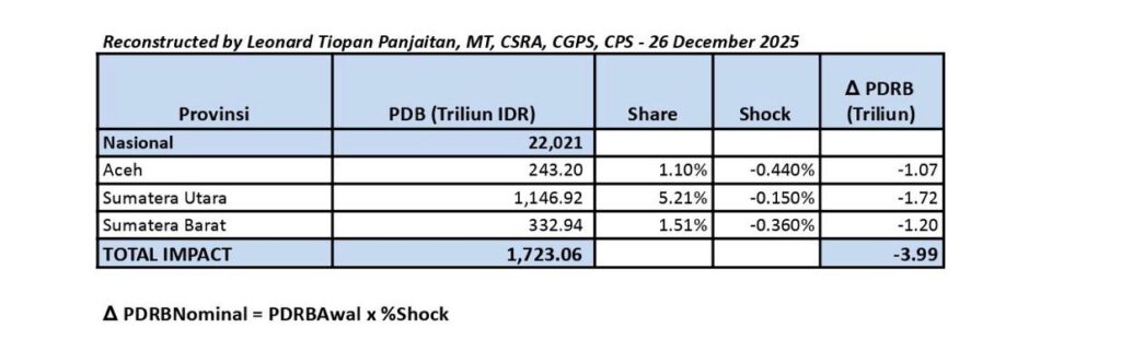 Berdasarkan simulasi ekonomi makro menggunakan model Computable General Equilibrium (CGE) dengan basis data Badan Pusat Statistik (BPS) 2024, Leonard memperkirakan bencana tersebut menyebabkan koreksi pertumbuhan ekonomi nasional sebesar -0,02%.